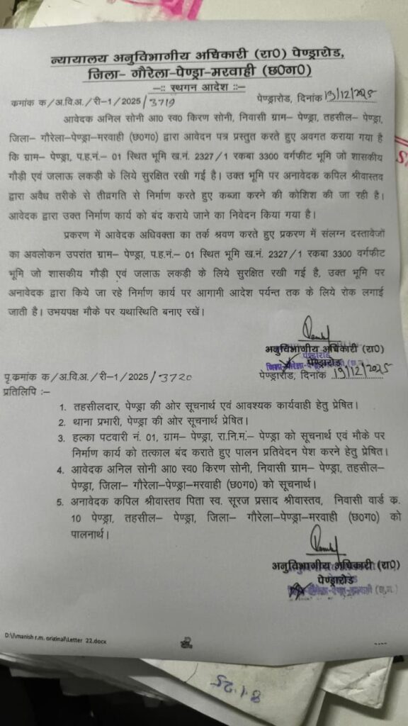 शिकायतकर्ता अनिल सोनी ने बताया कि उन्होंने कई महीनों से नगर पालिका अधिकारियों को इसकी सूचना दी, लेकिन कोई कार्रवाई नहीं हुई। आखिरकार एसडीएम कार्यालय में आवेदन करने पर 19 दिसंबर 2025 को स्थगन आदेश जारी हुआ, फिर भी 20 दिसंबर को निर्माण जारी रहा। पेंड्रा थाने की त्वरित कार्रवाई से कार्य रुकवाया गया।अनिल सोनी ने बताया, “यह जमीन शासकीय है, जो गौड़ी और जलाऊ लकड़ी के लिए सुरक्षित रखी गई है।