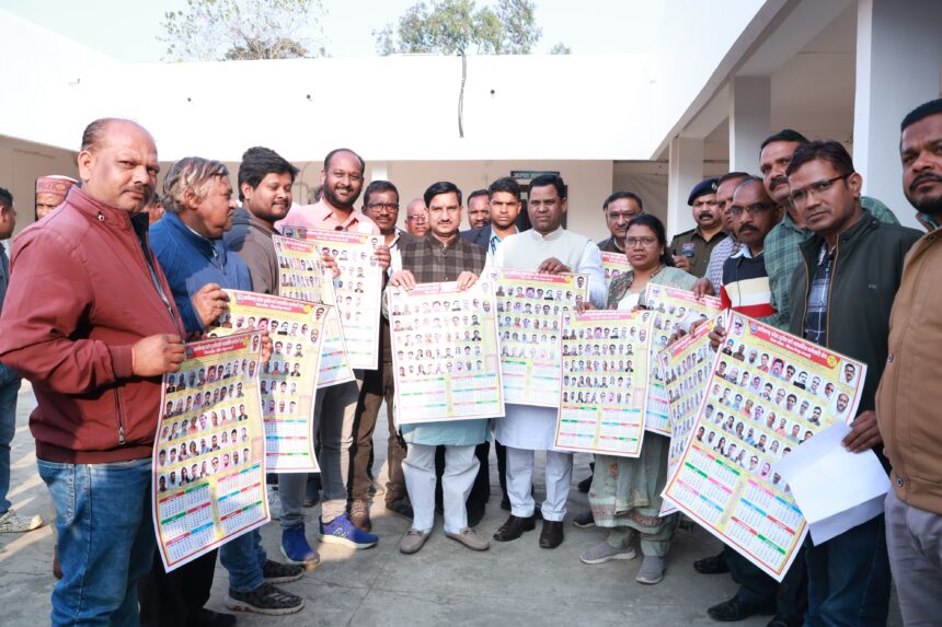 गौरेला पेंड्रा मरवाही :- आज जिला गौरेला पेंड्रा मरवाही में केंद्रीय मंत्री तोखन साहू जी के दौरे के दौरान, छत्तीसगढ़ तृतीय वर्ग कर्मचारी संघ के द्वारा वार्षिक कैलेंडर का विमोचन करवाया गया कैलेंडर का विमोचन केंद्रीय मंत्री तोखन साहू मरवाही विधायक प्रणव मरपच्ची एवं जिला कलेक्टर लेना कमलेश मंडावी के द्वारा जिला कार्यकारिणी की उपस्थिति में कराया गया उक्त कार्य जिला अध्यक्ष सचिन तिवारी संरक्षक नागेंद्र मणि त्रिपाठी के नेतृत्व में कराया गया उक्त विमोचन में पीयूष कुमार गुप्ता विशाल सिंह अशोक पांडे संजय सोनी उदय भारती गौरेला ब्लॉक अध्यक्ष तुलसीराम महिलांगे उपस्थित थे।