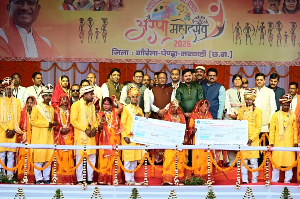 गौरेला-पेंड्रा-मरवाही, 10 फरवरी 2026/मुख्यमंत्री श्री विष्णु देव साय आज जीपीएम जिले के छठवें स्थापना दिवस पर आयोजित अरपा महोत्सव में शामिल होने मल्टीपरपज स्कूल खेल मैदान पहुंचे। मुख्यमंत्री ने महिला एवं बाल विकास विभाग की मुख्यमंत्री कन्या विवाह योजना अंतर्गत आयोजित सामूहिक विवाह कार्यक्रम में शामिल होकर 300 जोड़ों को शुभाशीष एवं आशीर्वाद प्रदान किया तथा उनके उज्जवल भविष्य की कामना की।